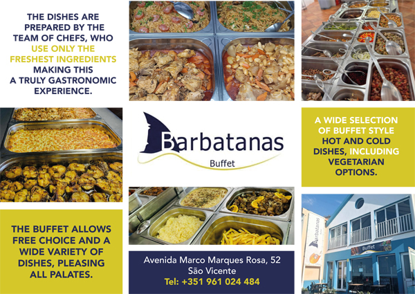 Barbatanas BuffetSão VicenteAvenida Marco Marques Rosa, 52 Sitio do Calhau961 024 4845%A wide selection of Buffet style hot and cold dishes, including vegetarian options. The dishes are prepared by the team of chefs, who use only the freshest ingredients making this a truly gastronomic experience. In addition, preferring the buffet allows free choice and a wide variety of dishes, pleasing all palates.