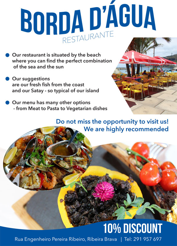 Borda D'AguaRibeira BravaRua Eng. Pereira Ribeiro291 952 06610%Renowned for super fresh Fish and Seafood, Seafood Rice, Picados, Grilled Meats, Pizzas, Pastas, Snacks, Salads and Vegetarian dishes. Excellent wine list and very friendly service. Come and enjoy our varied menu and a spectacular beachfront setting. Live music some evenings.