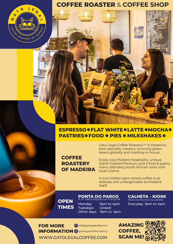Gato LegalRua Dr. Vasco Augusto de França, 58a960 311 6340%Gato Legal Coffee Roastery is Madeira’s best specialty roastery, sourcing green beans globally and roasting in-house. Enjoy cozy Madeiran hospitality, unique island-inspired flavours, and a food & pastry menu blending South African roots with local cuisine. A true hidden gem where coffee is as delicate and unforgettable as Madeira itself.