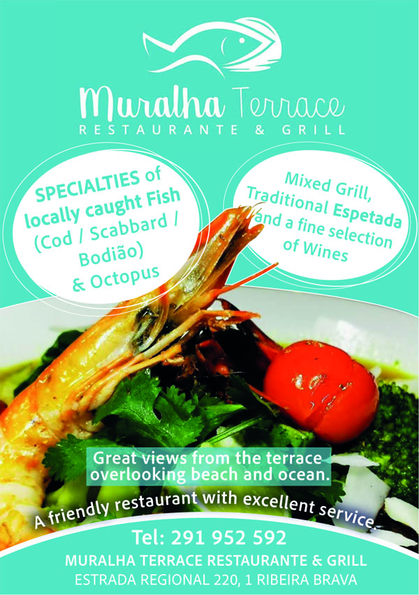 Muralha Terrace Restaurante & GrillRibeira BravaEstrada Regional 220, 1291 952 59210%Specialties of locally caught Fish (Cod / Scabbard / Bodiao), Octopus, Mixed Grill, traditional Espetada and a fine selection of wines. Great views from the terrace overlooking beach and ocean. A friendly restaurant with a good atmosphere. Excellent service.