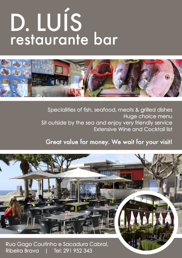 Restaurante Don LuisRibeira BravaRua Gago Coutinho e Sacadura Cabral291 952 54310%Specialities of fish, seafood, meats & grilled dishes. Huge choice menu to cater for every possible taste. The Fish is delivered daily it's that fresh! Sit outside by the sea and enjoy very friendly service. Great value for money. We wait for your visit!