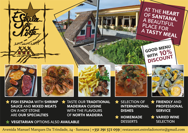 Restaurante Estrela Do NorteSantanaAvenida Manuel Marques Da Trindade, 24291 572 05910%Traditional Madeiran Cuisine. Fish Espada, Meat Espetada and mixed grill on stone are specialities. Variety of Fish dishes. Homemade Desserts. Great menu selection and value for money. Vegetarian options available. Huge Wine selection. Friendly and professional staff.