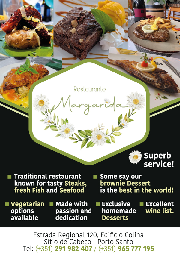 Restaurante MargaridaPorto SantoEstrada Regional 120, Sitio de Cabeco - Edificio Colina291 982 407 / 965 777 19510%Traditional restaurant known for tasty Steaks, fresh Fish and Seafood and exclusive homemade Desserts, where all are made with passion and dedication. The explosion of flavours is fantastic. Excellent wine list. Superb service. Vegetarian options available. Some say their brownie Dessert is the best in the world!