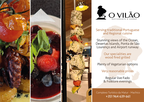Restaurante O VilaoMachicoComplexo Turístico da Matur964 639 66115%Serving traditional Portuguese and Regional cuisine, with stunning views of the Ocean, Desertas Islands, Ponta de São Lourenço and Airport runway. The service and food are top-quality. Our specialities are grilled on a wood fire. Plenty of Vegetarian options. Very reasonable prices. Regular live Fado & Folklore evenings.
