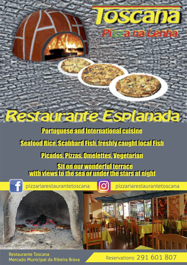 Restaurante ToscanaRibeira BravaMercado Municipal da Ribeira Brava, 1st Floor291 601 80710%Portuguese and International cuisine. Seafood Rice, Scabbard Fish, freshly caught local Fish; Picados, Pizzas, Omelettes, Vegetarian options. Sit on our wonderful terrace with views to the sea or under the stars at night.