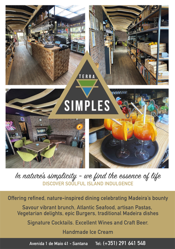 Terra SimplesSantanaAvenida 1 de Maio, 41291 641 54810%Terra Simples in Santana offers refined, nature-inspired dining celebrating Madeira’s bounty. Savour vibrant brunch, Atlantic Seafood, artisan Pastas, Vegetarian delights, epic Burgers, traditional Madeira dishes, signature Cocktails, handmade Ice Cream, excellent Wines, and craft Beers. In nature’s simplicity, we find the essence of life. Discover soulful island indulgence.